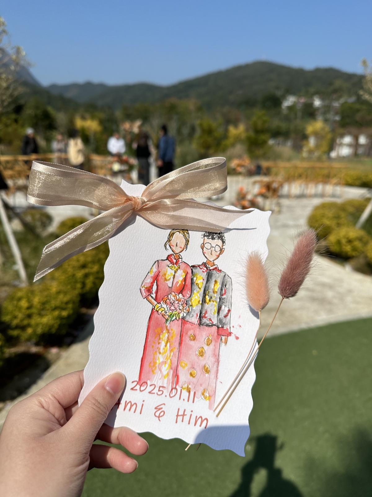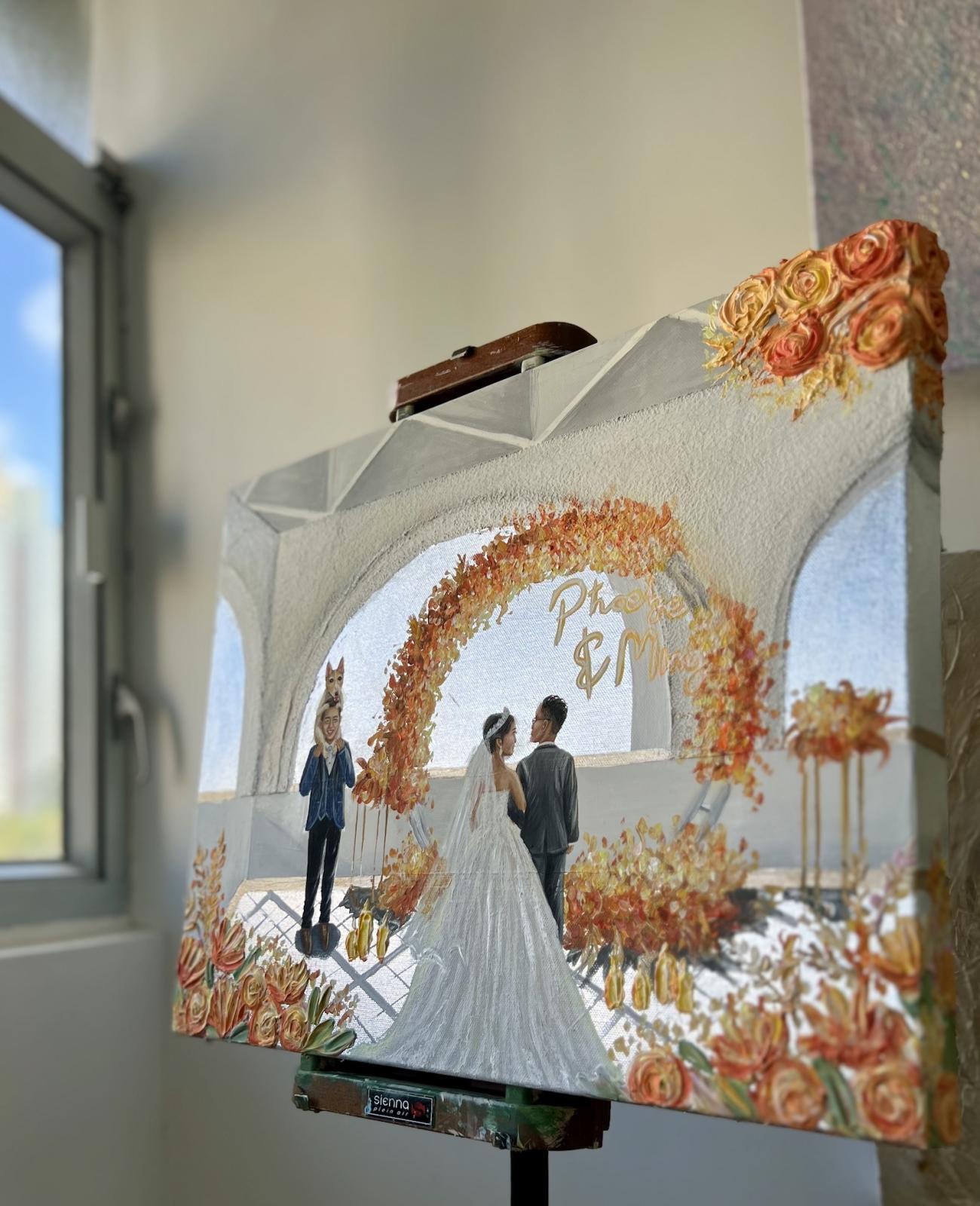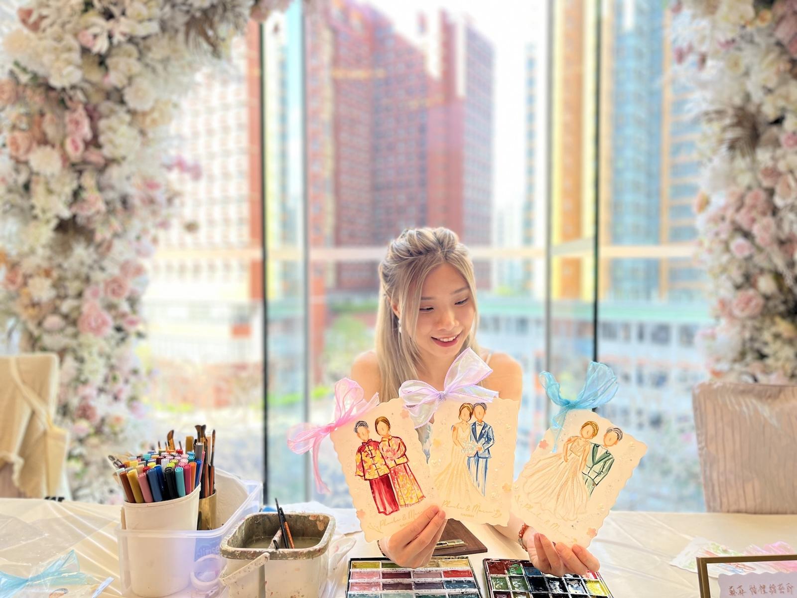 其中一個最令 Sophia 感動的作品,是一位新娘希望將已故婆婆畫進婚禮現場。婆婆自小照顧她,是她生命中最重要的人。婚禮當日出現了奇妙的巧合,新娘為婆婆設計的紫紅色旗袍,竟與外公所穿的衣服顏色完全一致。當畫作完成時,全場親友都被深深觸動;新娘的叔叔更凝視畫作良久,含笑對她說:「多謝你畫咗我媽媽。」那一刻,Sophia 深切感受到藝術的力量,它不僅能圓滿心願,更能串連所有人的情感。另一個難忘的案例,是一位新娘希望重現由父親牽着她進場的畫面。特別的是,他們以跳舞與 K-pop 音樂登場,氣氛輕快而動人。這份獨特的回憶透過畫作被完整保留,新娘事後告訴她,每次看着畫,都能回到與父親共舞的珍貴時光。這些故事讓 Sophia 深深體會到,作品不只是畫作,更是一份能喚起愛與回憶的情感連結。